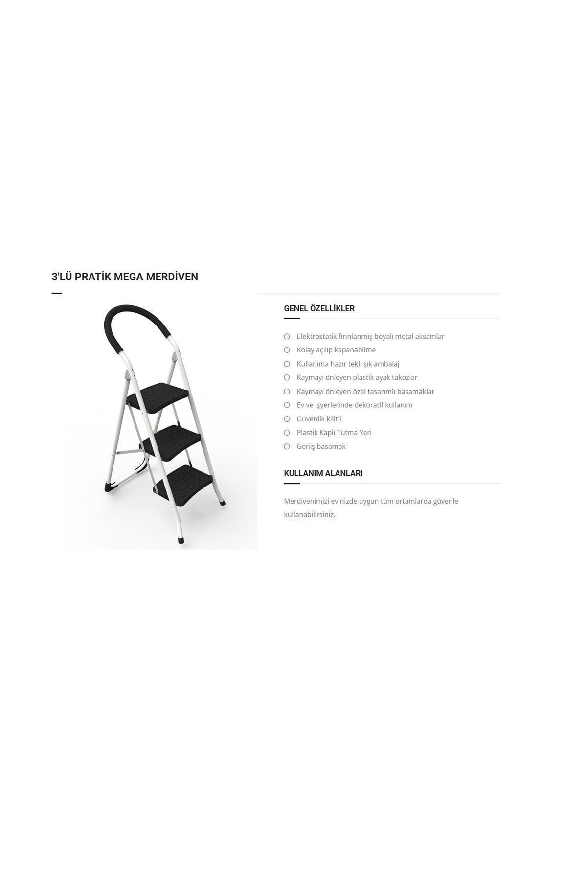 Saraylı Pratik Mega Metal 3 Basamaklı Merdiven Ev Merdiveni ; Elektrostatik fırınlanmış boyalı metal aksamlar. ; Kolay açılıp kapanabilme. ; Kullanıma hazır tekli şık ambalaj. ; Kaymayı önleyen plastik ayak takozlar. ; Kaymayı önleyen özel tasarımlı basamaklar. ; Ev ve işyerlerinde dekoratif kullanım. ; Güvenlik kilitli. ; silikon Plastik Kaplı Tutma Yeri. ; Geniş basamak. ; Katlanabilme Özelliği: Var. ; Ana Gövde: Metal. ; Basamak: Sert Plastik ; Basamak Sayısı: 3. ; Ağırlık: 5.25 Kg. ; Ebatlar: 740 / 430 / 1090 mm. ;